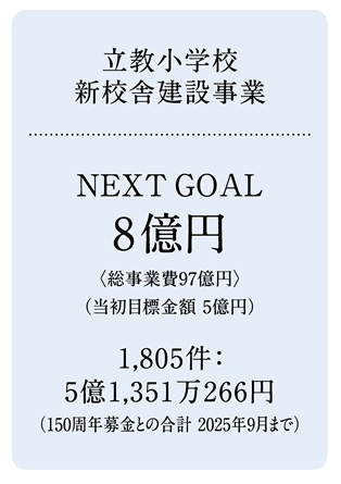 | 立教小学校 校長 田代 正行 「小学校新校舎建設事業」は、皆さまの甚大なるご支援のおかげをもちまして、目標金額として定めた5億円を超えることができました。ご支援くださった皆さまに、関係者一同改めて心より感謝申し上げます。 2025年1月に起工式を行い、2026年9月からの新校舎利用に向けて工事は進んでおります。しかしながら、資材や人件費の高騰により総事業費が64億円から97億円へと1.5倍に跳ね上がっており、まだまだ皆さまからのご支援を賜らざるを得ない状況でございます。 そこで、甚だ僭越ではございますが、NEXT GOALとして8億円を掲げることといたしました。 教室での座学中心の学びから、さまざまな人数・形態での学びが教室からあふれ出すような、学校全体が学びの場であり遊び場となる新校舎建設のため、重ね重ねのお願いで誠に恐縮ですが、皆さまのご支援を伏してお願い申し上げます。 2025年11月 |